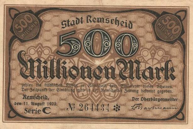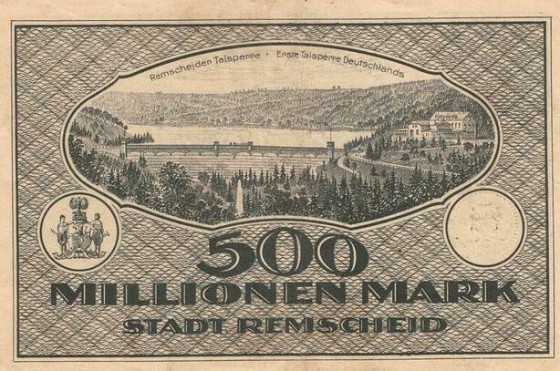 Q4582 Banknote Germany Remscheid Talsperre 500 Millionen Mark 1923 Notgeld
