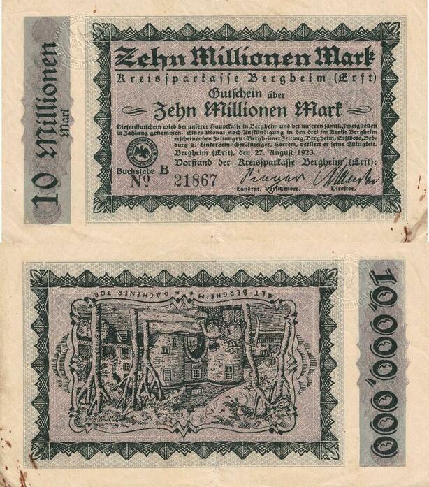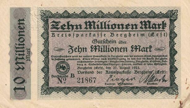 Q4587 Banknote Germany Bergheim 10 Millionen Mark 1923 Notgeld - Make Offer