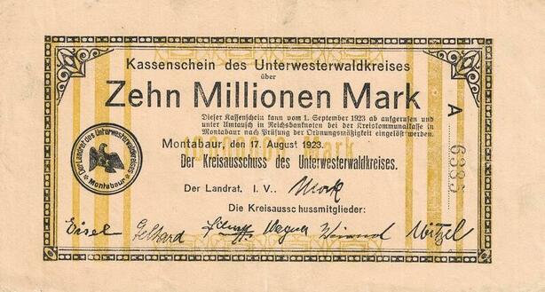 Q4590 Banknote Germany Montabaur Kassenschein 10 Millionen Mark 1923 AU - Offer