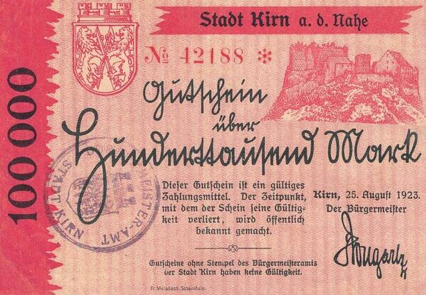 Q4591 Banknote Germany Kirn Stadt 100000 Mark 1923 - Make Offer