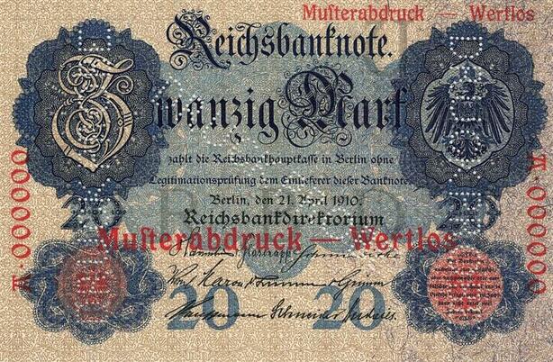 Q4651 Rare Banknote Germany Berlin 20 Mark Druck Probe 0000000 1910 UNC - Offer