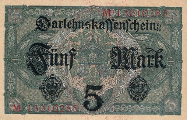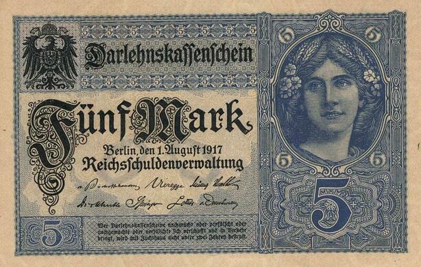 Q4654 Banknote Germany Berlin 5 Marks Eagle Darlehenskassenschein 1917 AU