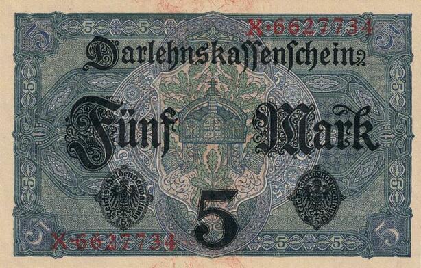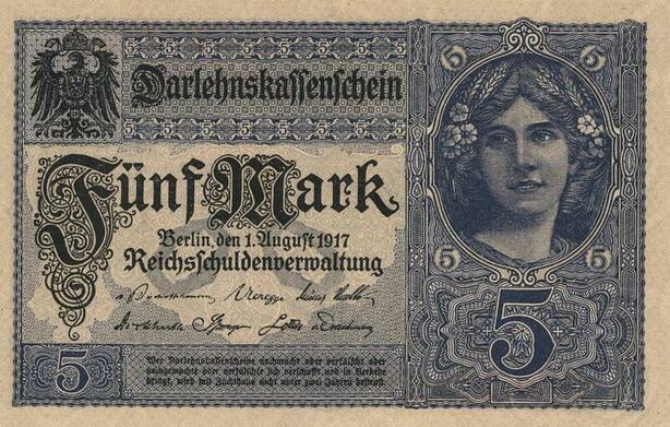Q4655 Banknote Germany Berlin 5 Marks Eagle Darlehenskassenschein 1917 AU