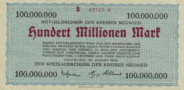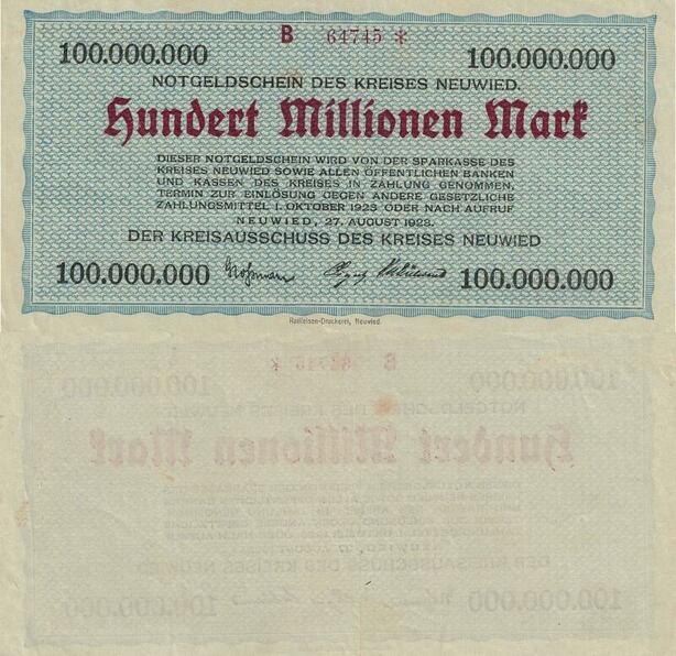Q4671 Banknote Germany Neuwied 100 Millionen Mark 1928 Notgeld AU - Offer