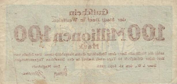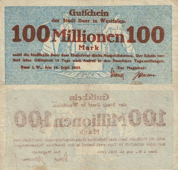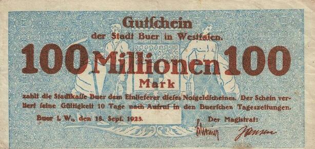 Q4676 Banknote Germany Buer Westfalen 100 Millionen Mark 1923 Notgeld