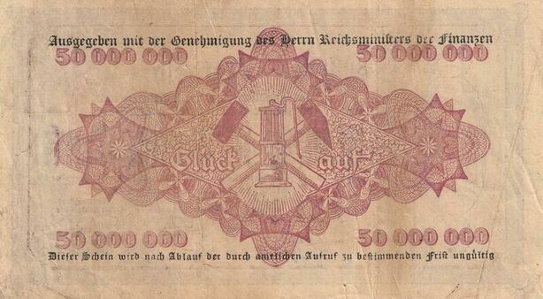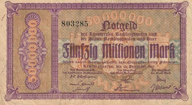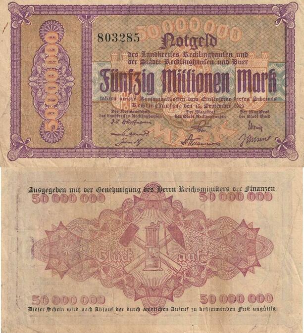Q4677 Banknote Germany Recklinghausen Buer 50 Millionen Mark 1923 Notgeld