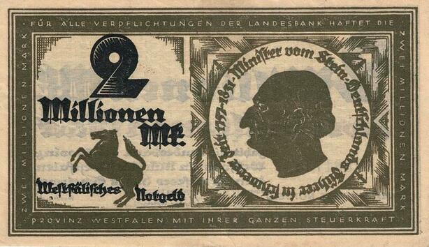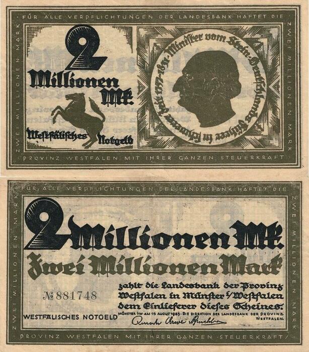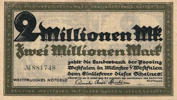 Q4690 Banknote Germany Münster 2 Millionen Mark Landesbank Provinz 1923 Notgeld
