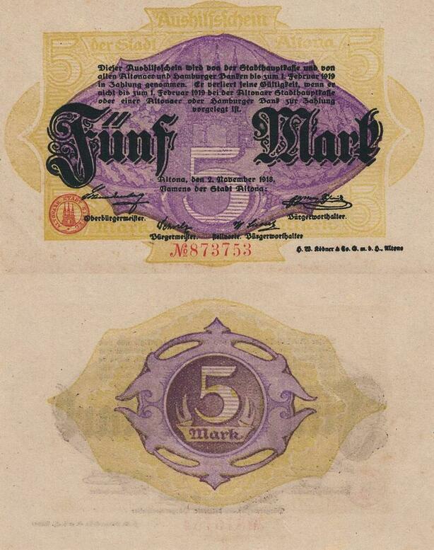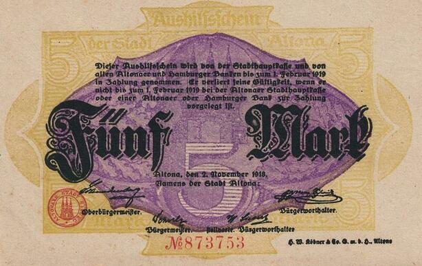 Q4702 Banknote Germany Altona Stadt 5 Marks 1918 AU - Make Offer