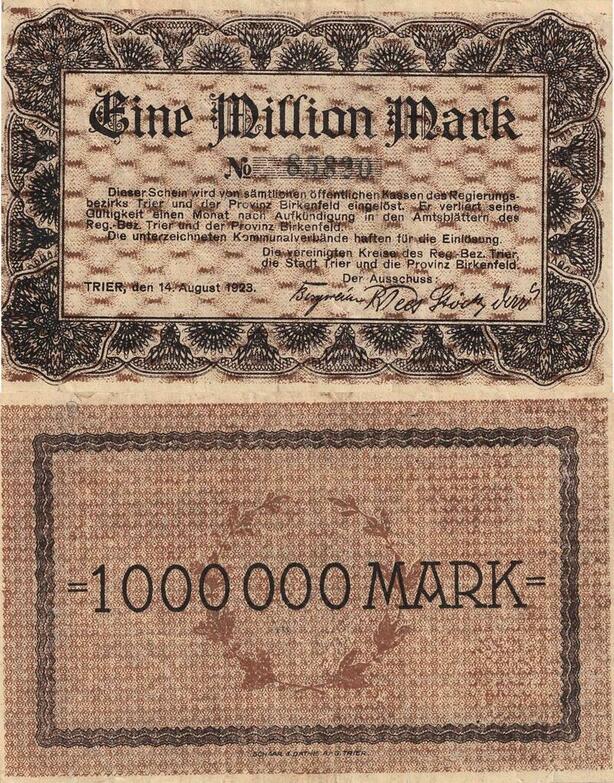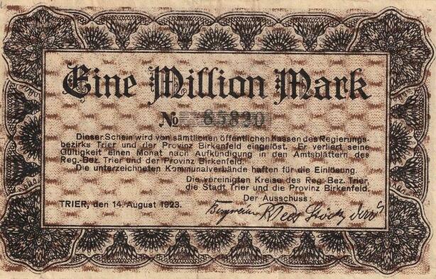 Q4734 Banknote Germany Trier Stadt 1 Million Mark Provinz Birkenfeld 1923
