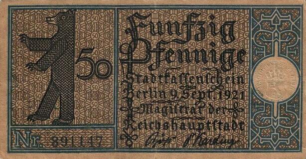 Q4916 Banknote Germany Berlin 50 Pfennig Bear 1921 - 1845 - AU Make Offer