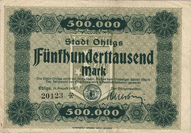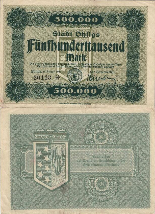Q4995 Banknote Germany Ohligs 500 000 Mark Coat of Arms 1923 - Make Offer