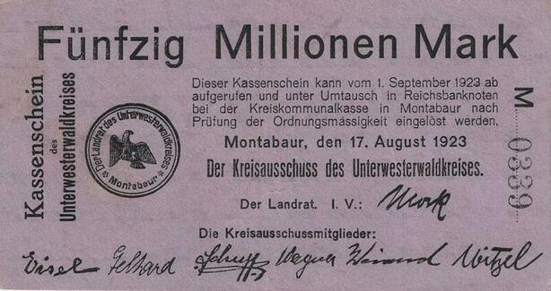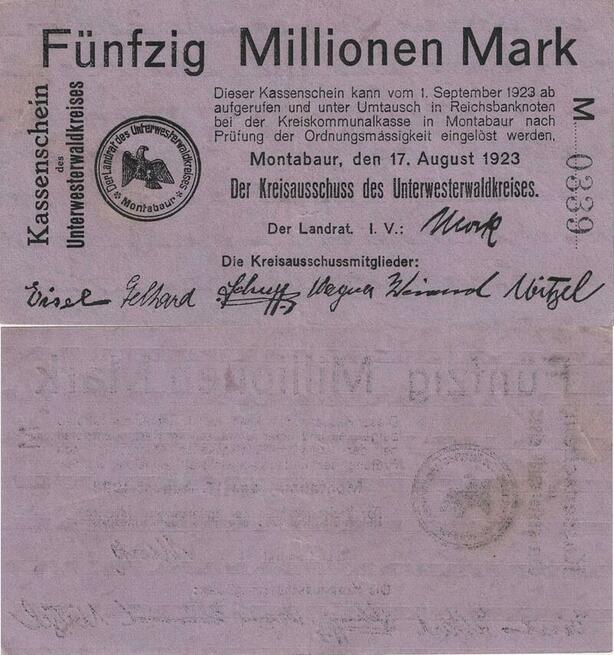 Q5013 Banknote Germany Montabaur 50 Millionen Mark Onesided 1923 - Offer