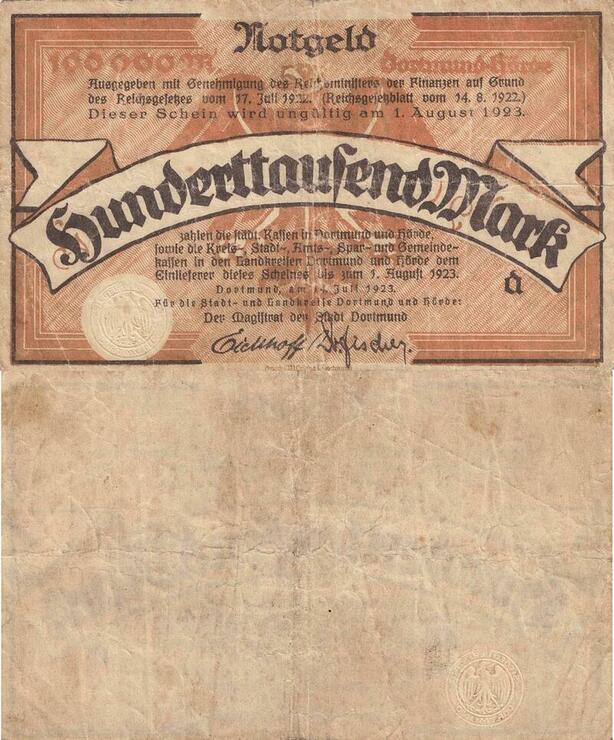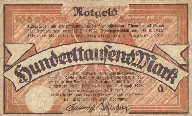 Q5022 Banknote Germany Dortmund 100000 Mark Onesided 1923 - Make Offer