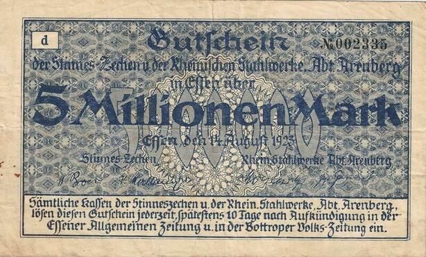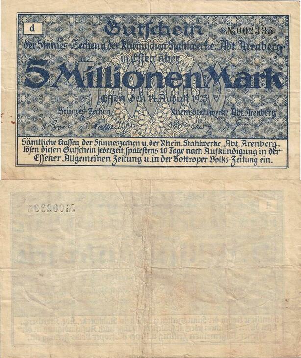 Q5030 Banknote Germany Darmstadt Arenberg 5 Millionen Mark Onesided 1923 - Offer