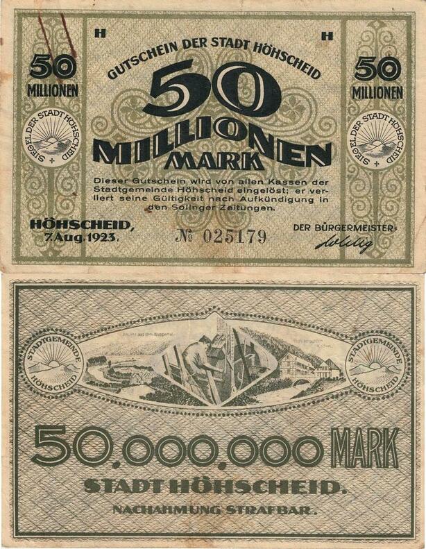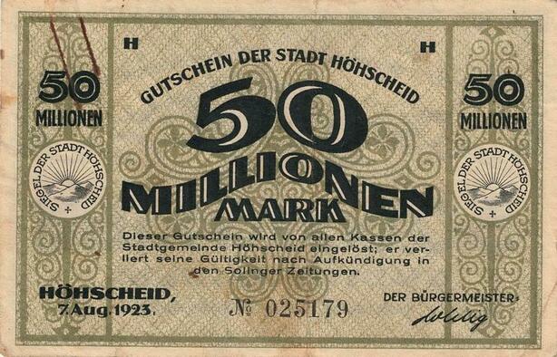 Q5046 Banknote Germany Höhscheid 50 Millionen Mark 1923 Notgeld