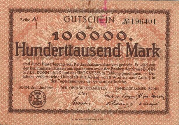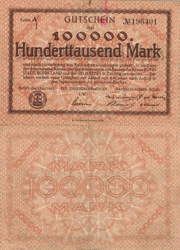 Q5049 Banknote Germany Bonn and Siegkreis 100000 Mark Districts 1923 - Make Offer