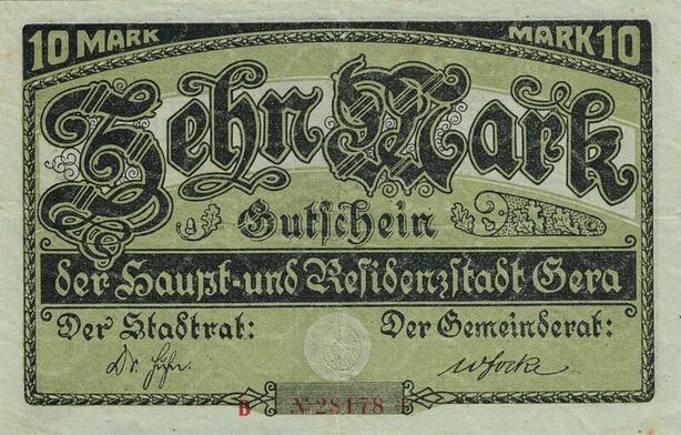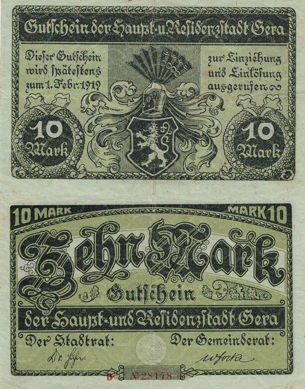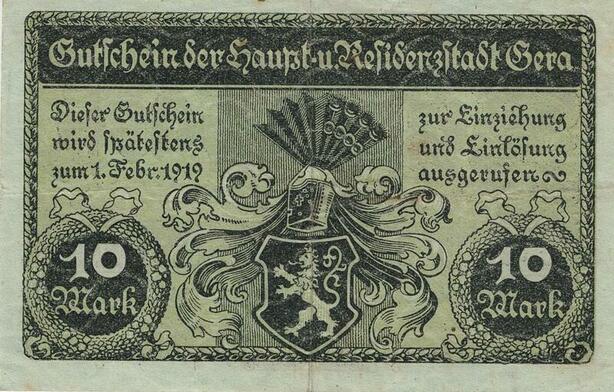 Q5053 Banknote Germany Refider Gera 10 Mark 1919 Notgeld - Make Offer