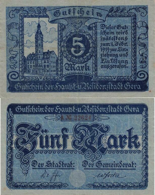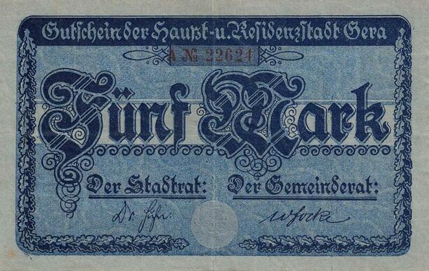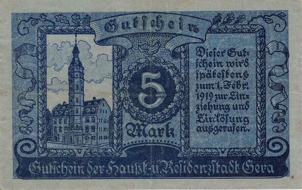 Q5054 Banknote Germany Refider Gera 5 Mark 1919 Not geld - Make Offer