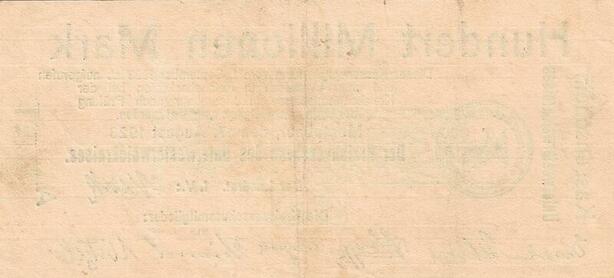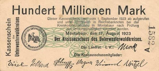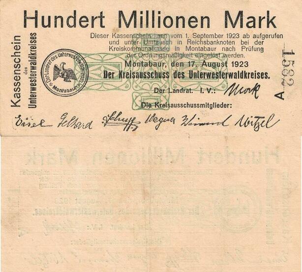 Q5057 Banknote Germany Montabaur 100 Mark Millionen Kassenschein 1923 Notgeld