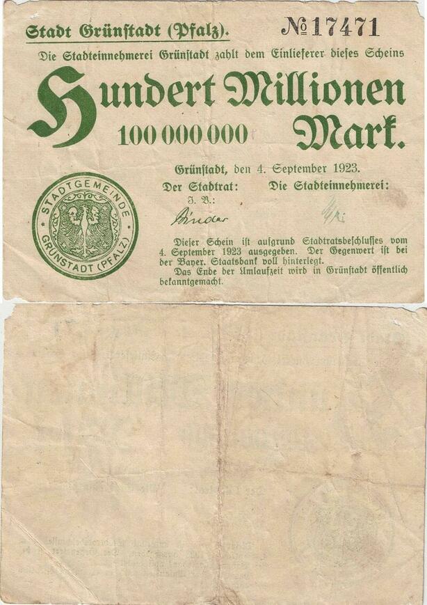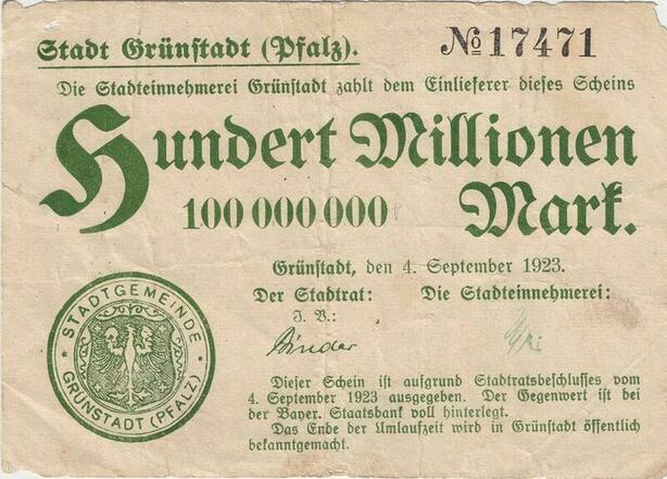 Q5120 Banknote Germany Grünstadt 100 Millionen Mark 1923 - Make Offer