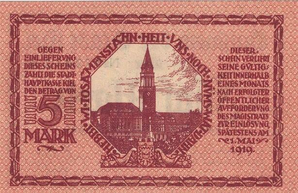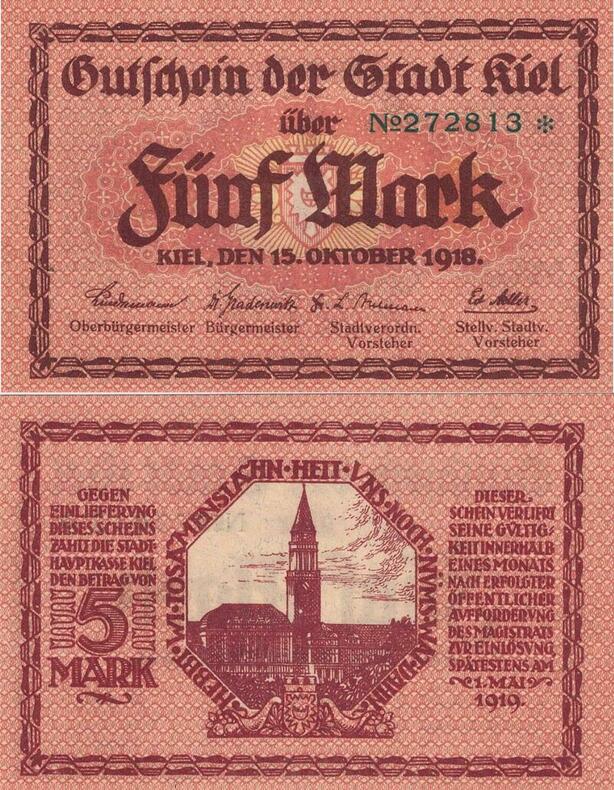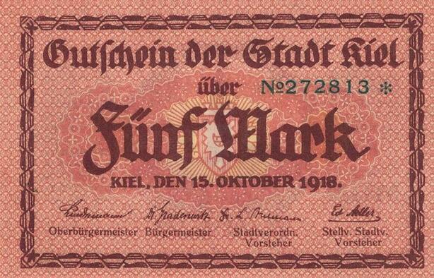 Q5133 Banknote Germany Kiel 5 Mark Gutschein 1918 - Make Offer