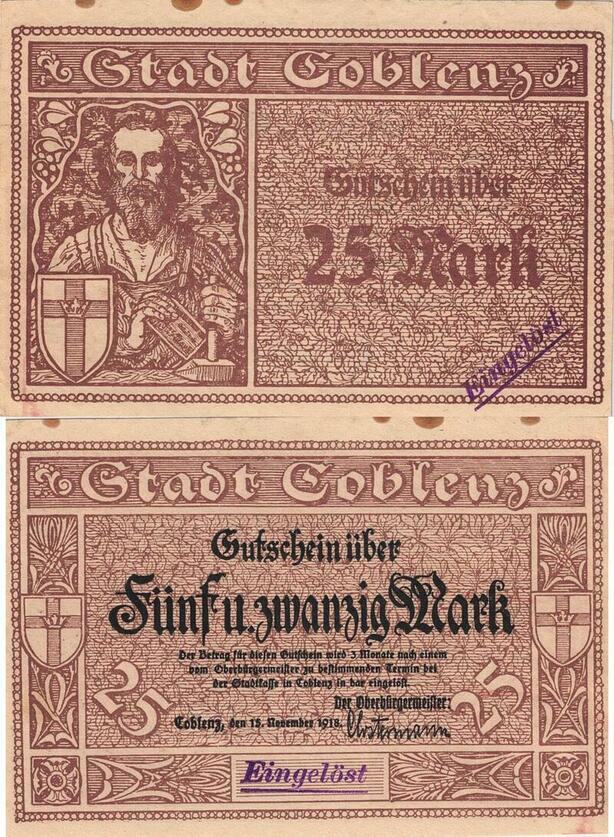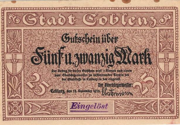Q5138 Banknote Germany 25 Mark Stadt Coblenz 1918 - Make Offer