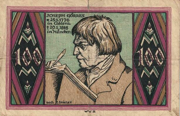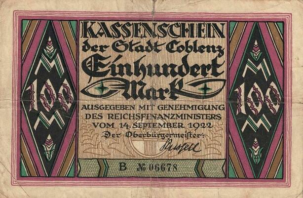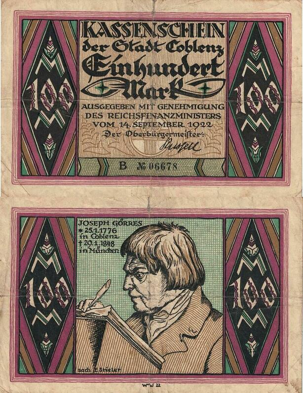 Q5139 Banknote Germany 100 Mark Joseph Gorres Kaffenschein Coblenz 1922