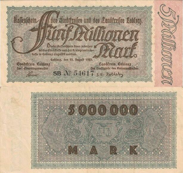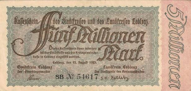 Q5140 Banknote Germany 5 Millionen Mark Kaffenschein Coblenz 1923 - M Offer