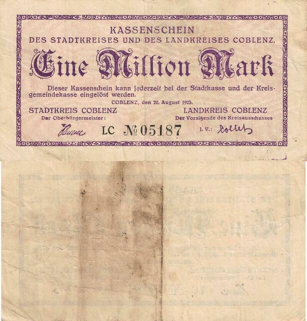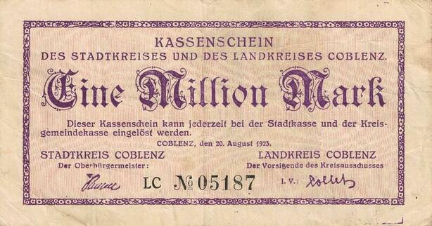 Q5142 Banknote Germany 1 Millionen Mark Kaffenschein Coblenz 1923 - M Offer