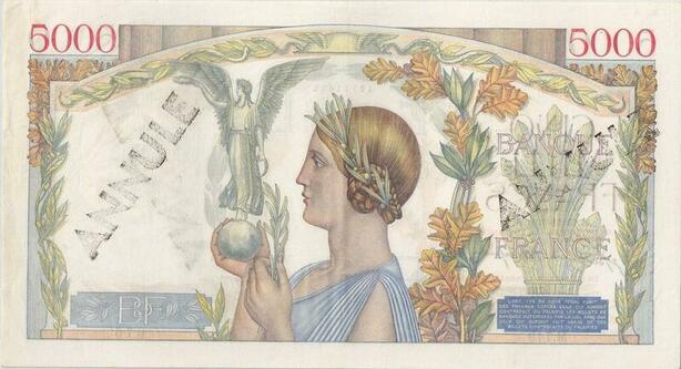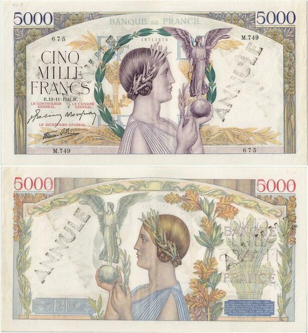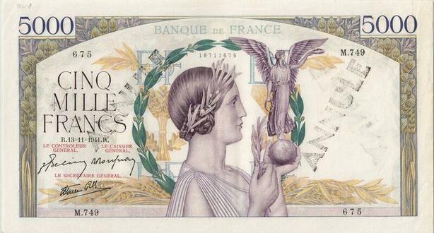 Q5148 Très Rare France 5000 Francs Victoire 1941 Annulé PCGS AU55 -> Make offer