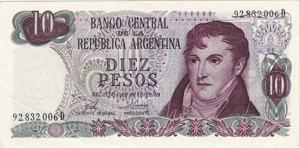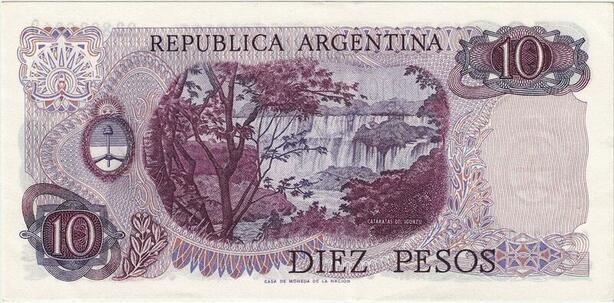 Q5254 Banknote Argentina 10 Pesos Manuel Belgrano Waterfalls 1974-1976