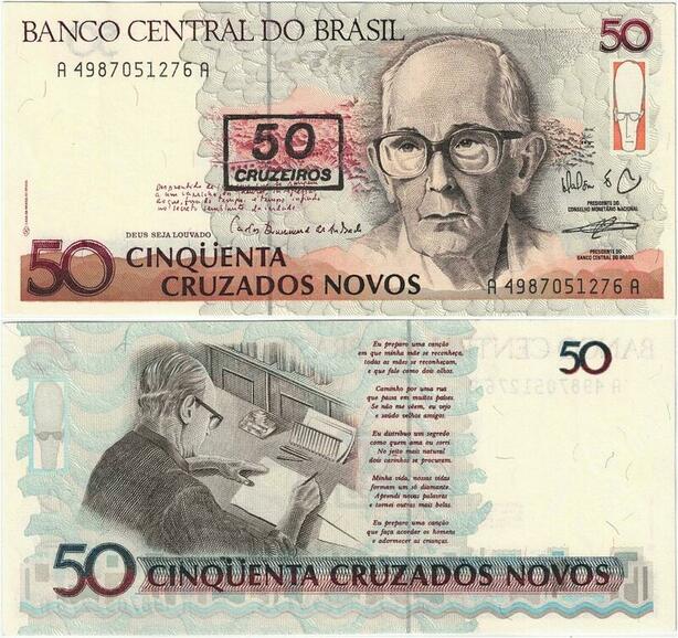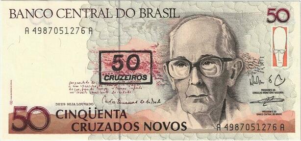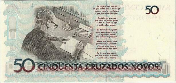 Q5333 Banknote Brazil 50 Cuzados novos Carlos Drummond de Andrade 1989-1990