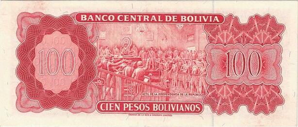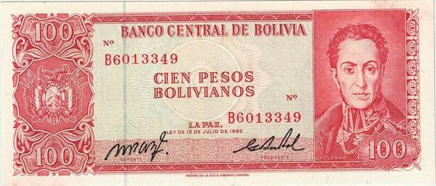 Q5336 Banknote Bolivia 100Pesos Simon Bolivar Declaration Bolivian Rep 1962