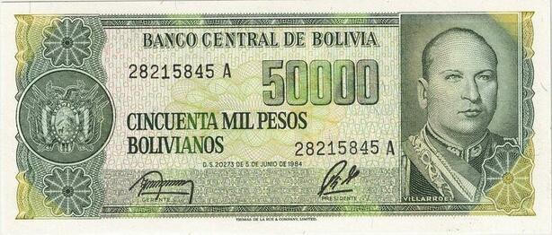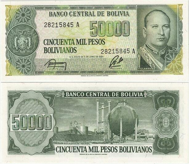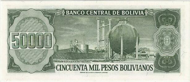 Q5338 Banknote Bolivia50000 Pesos GualbertoVillarroelPetroleum refinery1984