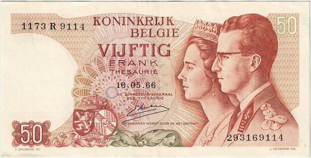 Q5674 Banknote Belgium 50 Francs Baudouin I Queen Fabiola 1966 AU -> Make offer