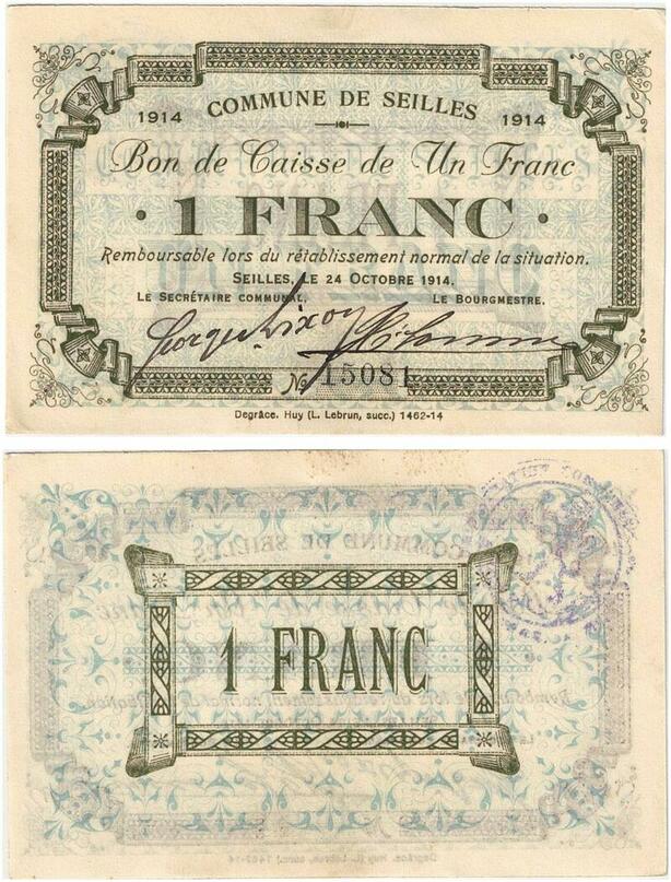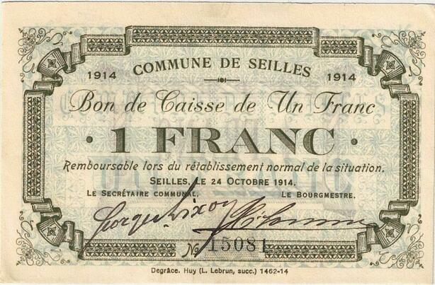 Q5721 Banknote Belgium Ardennes Seilles WWI 1 Franc 1914 AU -> Make offer
