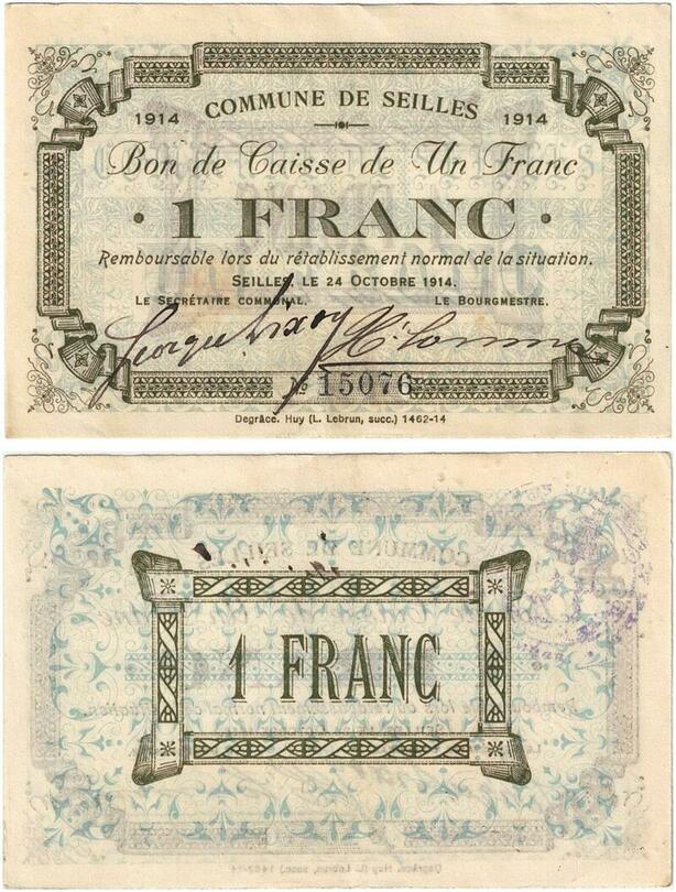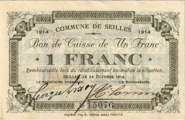 Q5722 Banknote Belgium Ardennes Seilles WWI 1 Franc 1914 -> Make offer