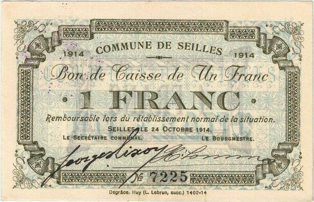 Q5732 Banknote Belgium Ardennes Seilles WWI 1 Franc 1914 AU -> Make offer