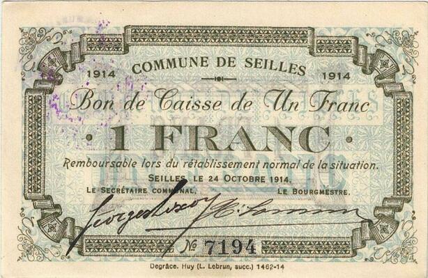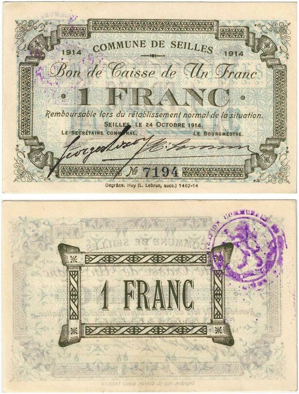 Q5735 Banknote Belgium Ardennes Seilles WWI 1 Franc 1914 AU -> Make offer