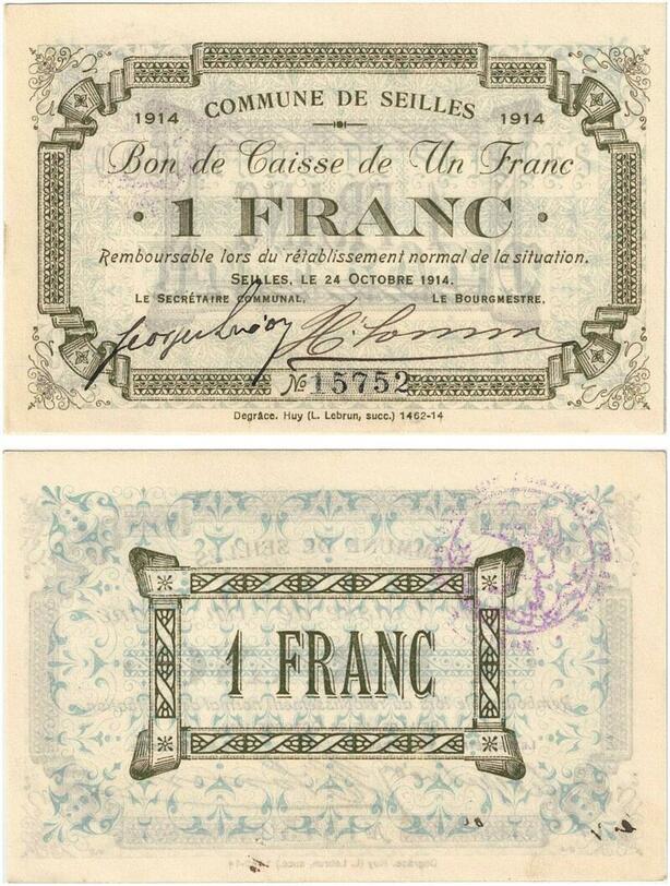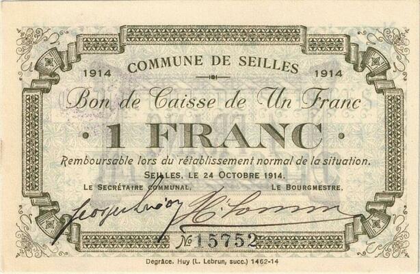 Q5737 Banknote Belgium Ardennes Seilles WWI 1 Franc 1914 UNC -> Make offer