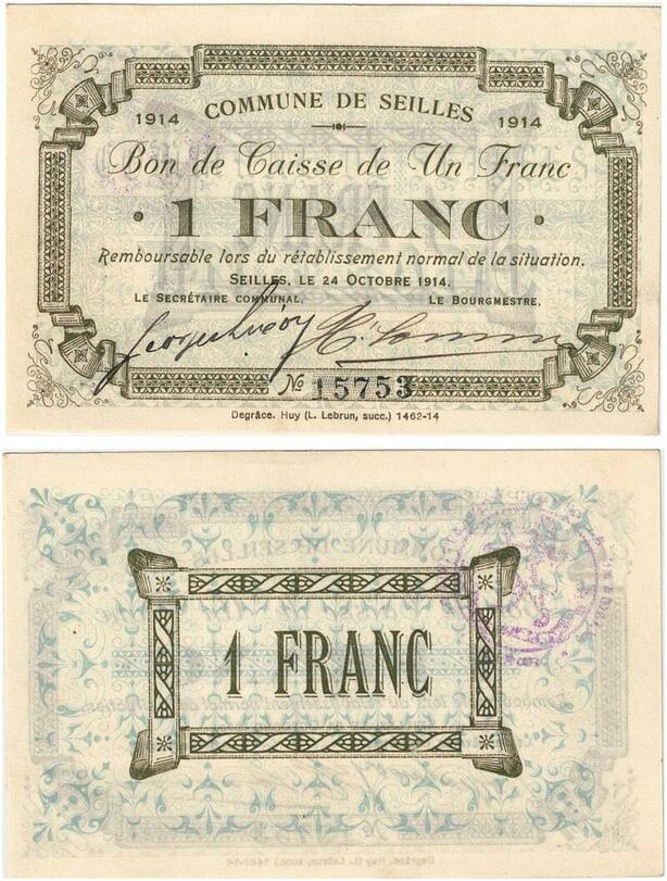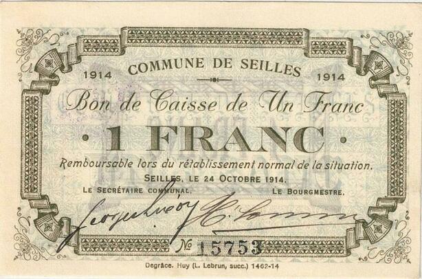 Q5739 Banknote Belgium Ardennes Seilles WWI 1 Franc 1914 UNC -> Make offer