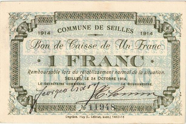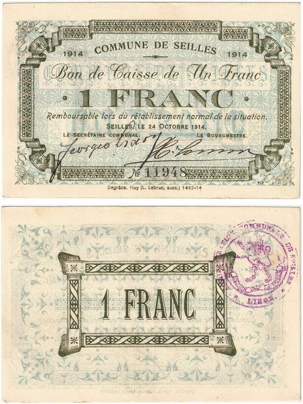 Q5752 Banknote Belgium Ardennes Seilles WWI 1 Franc 1914 UNC -> Make offer