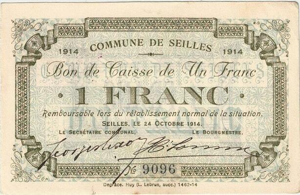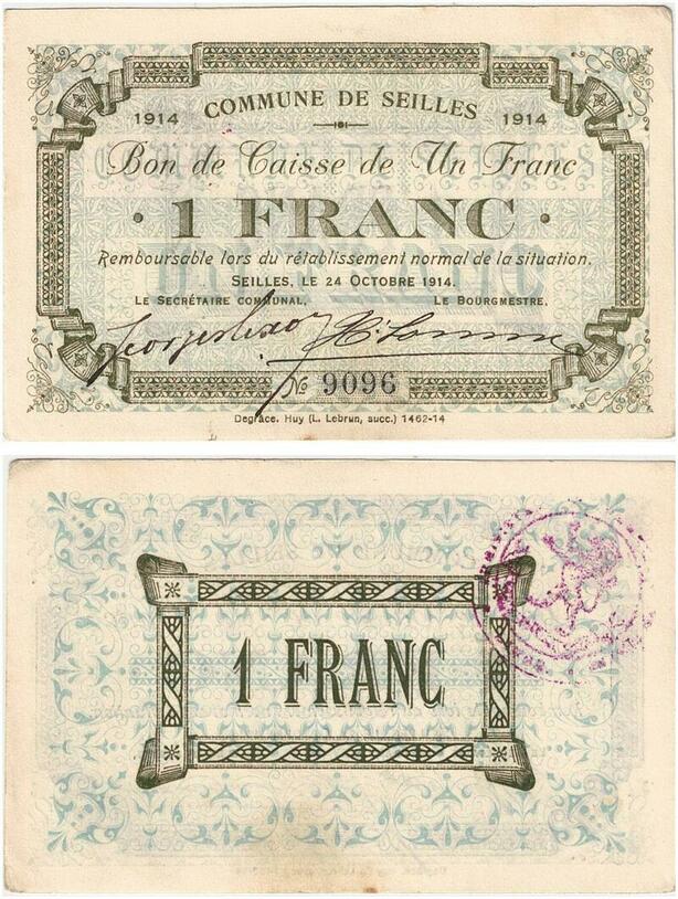 Q5756 Banknote Belgium Ardennes Seilles WWI 1 Franc 1914 AU -> Make offer