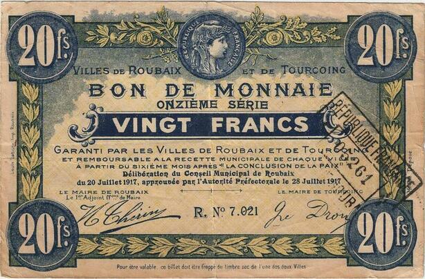 Q5803 Banknote France Roubaix Tourcoing 20 Francs Nécessité 1917 -> Make offer
