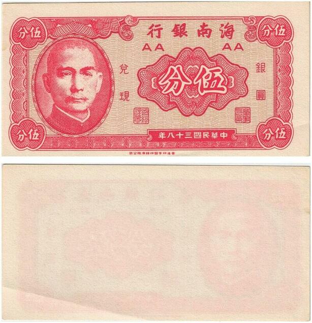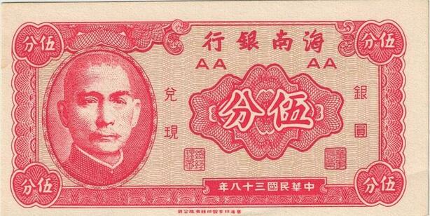 Q5967 Banknote Taiwan China 5 Fen Hainan Bank Sun Yat-Sen 1949 UNC -> Make offer
