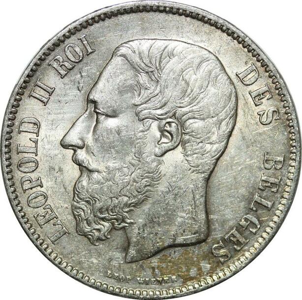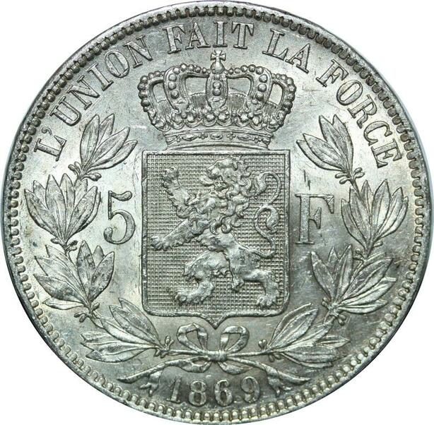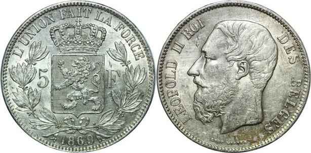 R1047 Belgium 5 Francs Leopold II Roi des Belges 1869 Argent AU -> Make offer