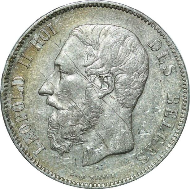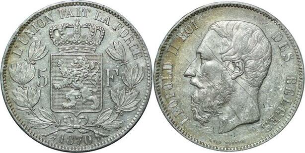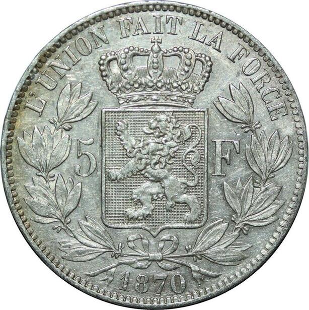 R1052 Belgium 5 Francs Leopold II Roi des Belges 1870 Argent -> Make offer