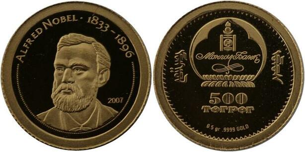 R1257 Mongolia 500 Tögrög Alfred Nobel 2007 Or Gold BE PF -> Make offer