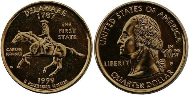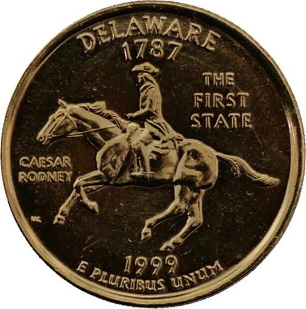 R1384 USA Delaware Quarter 1/4 Dollar Caesar Rodney 1787 1999 Gold Plated UNC