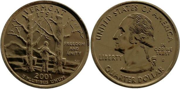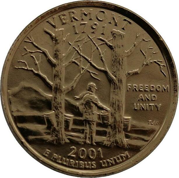 R1390 USA Vermont Quarter 1/4 Dollar Freedom Unity 1791 2001 Gold Plated UNC
